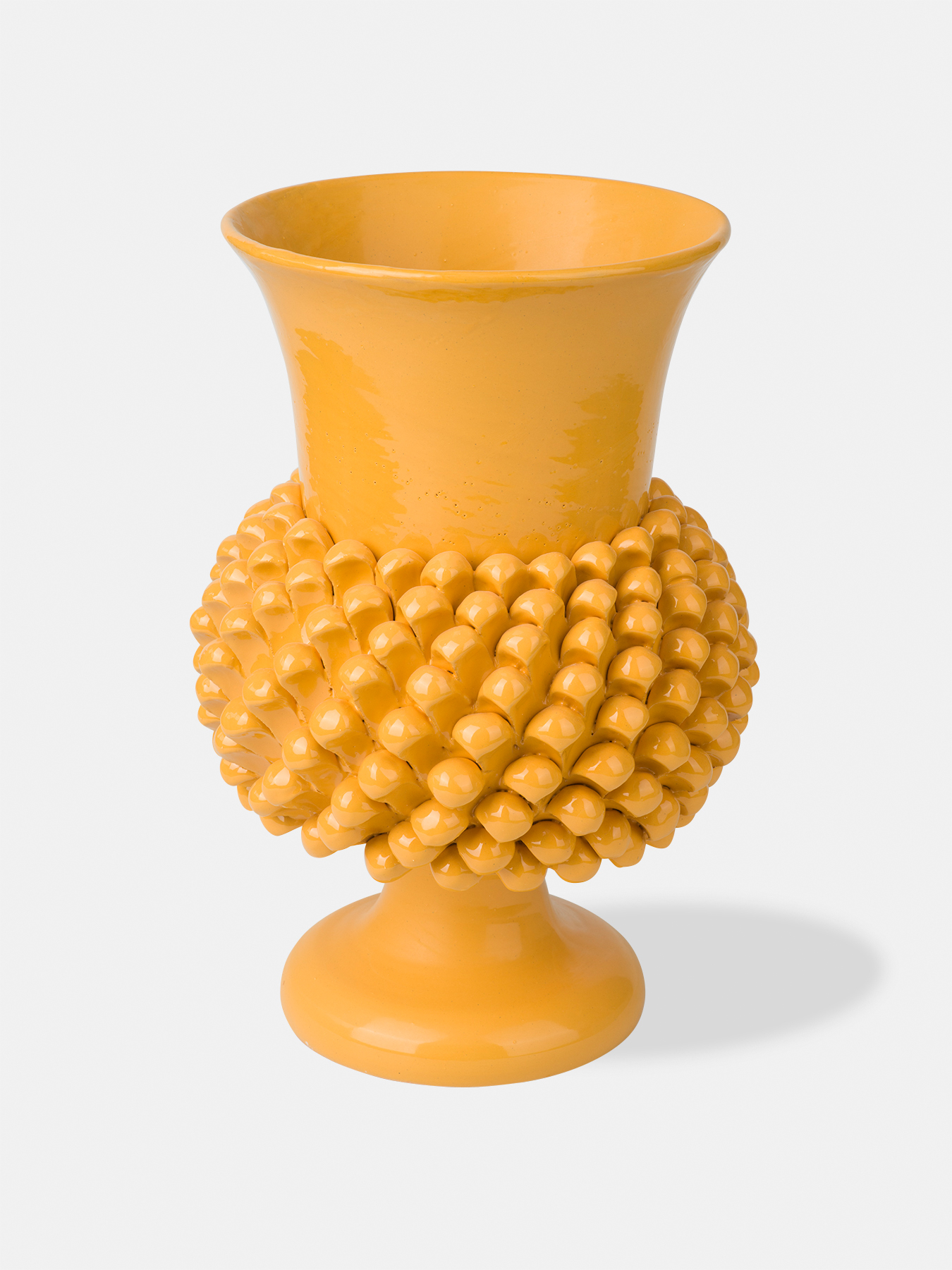 Diese gelbe Vase, handgefertigt aus Sizilien, ist eine strahlende Gelb-Hochglanz-Blumenvase, die mit einer strukturellen Verzierung in Form eines Pinienzapfens versehen ist. Das lebendige Gelb der Vase erzeugt eine einladende und auffällige Präsenz. Die Hochglanzoberfläche verleiht der Vase einen glänzenden, fast spiegelnden Effekt, der das Licht einfängt und das Gefäß zum Strahlen bringt. Die strukturelle Verzierung, die die Form eines Pinienzapfens hat, ist kunstvoll in die Vase eingearbeitet. Jeder Teil des Zapfens ist sorgfältig gestaltet, um die realistischen Schuppen und die natürliche Textur eines Pinienzapfens zu imitieren. Diese Verzierung verleiht der Vase eine faszinierende Tiefe und Struktur, die das Auge anzieht und zum Betrachten einlädt. Die Vase zeigt das handwerkliche Können aus Sizilien in seiner besten Form. Jeder Aspekt der Vase, von der Formgebung bis zur Verzierung, spiegelt die Kunstfertigkeit und die Hingabe der Handwerker wider. Sie vereint Funktionalität und Kunst zu einem beeindruckenden Objekt, das die Schönheit der Handwerkskunst und die kulturelle Identität Siziliens repräsentiert. Insgesamt verkörpert diese gelbe Hochglanz-Blumenvase aus Sizilien mit ihrer lebendigen Farbe, der glänzenden Oberfläche und der kunstvollen Verzierung in Form eines Pinienzapfens eine gelungene Kombination aus lebhafter Eleganz, Tradition und kunstvoller Gestaltung.