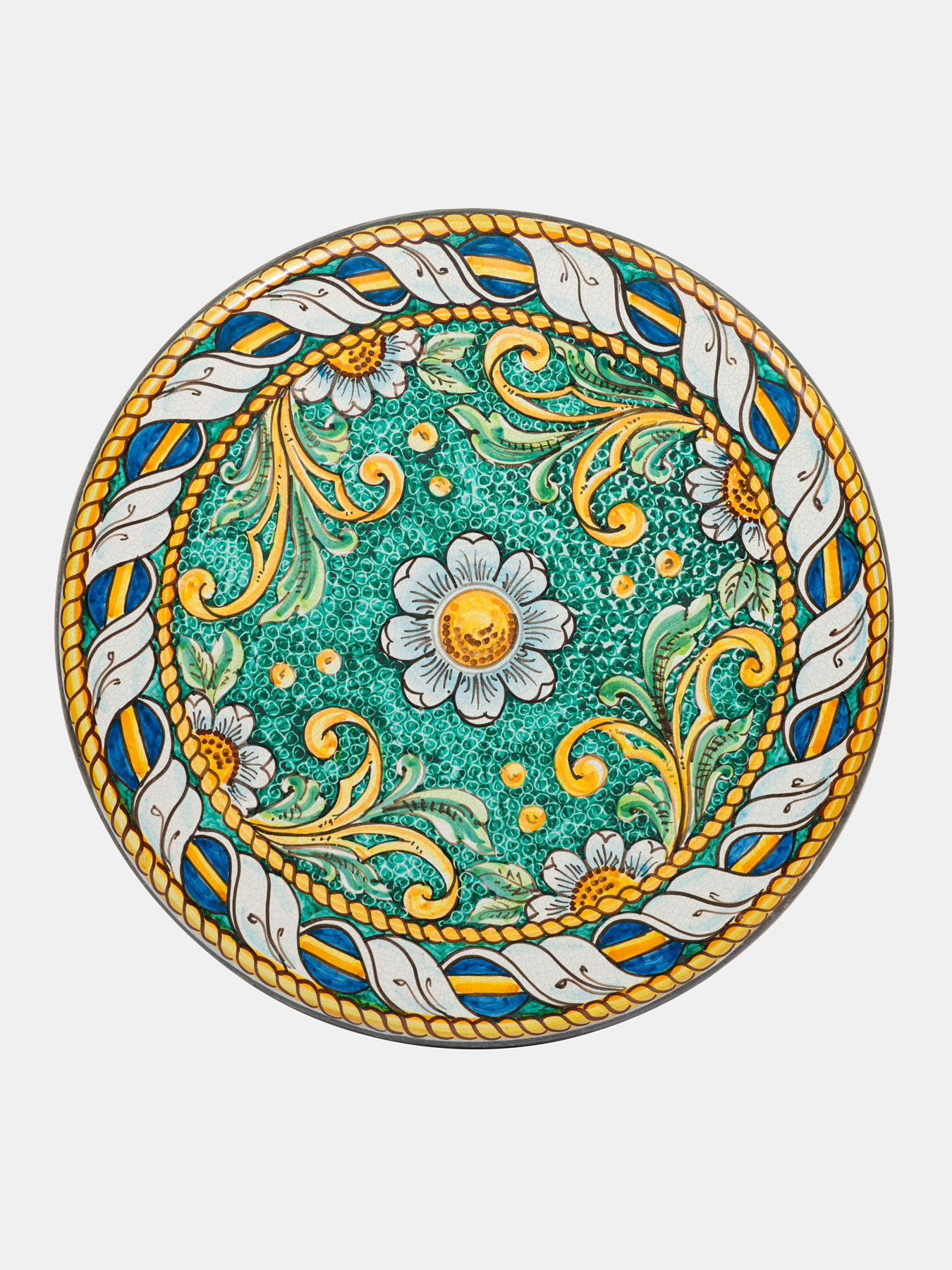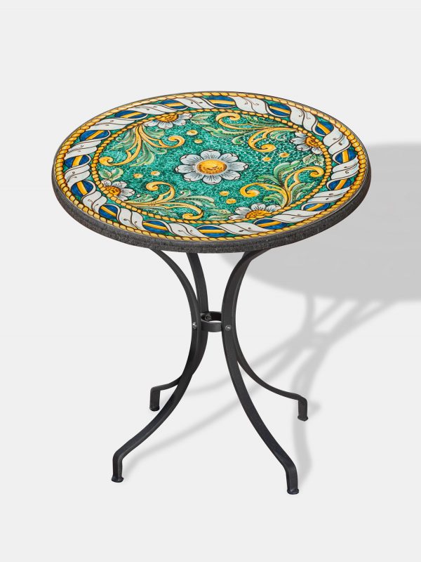 Die Gänseblümchendekoration auf einem smaragdgrünen Hintergrund verleiht diesem Tisch eine charmante und zugleich elegante Note. Die Gänseblümchenmotive wurde kunstvollauf den smaragdgrünen Hintergrund gemalt oder graviert sein, was dem Tisch eine delikate und kunstvolle Ästhetik verleiht. Die Kombination von zarten Gänseblümchen mit dem tiefen, satten smaragdgrünen Hintergrund schafft einen Kontrast, der die Schönheit der Details hervorhebt und eine lebendige visuelle Präsenz erzeugt. Die Rundform des Couchtisches trägt zur Harmonie des Designs bei und verleiht ihm eine ausgewogene Ästhetik. Diese Form kann auch die fließende und organische Natur des Gänseblümchenmotivs unterstützen, während sie gleichzeitig eine gemütliche und einladende Atmosphäre um den Tisch herum schafft. Dieser Couchtisch aus Lavastein mit Gänseblümchendekoration auf einem smaragdgrünen Hintergrund vereint Kunstfertigkeit, Naturmaterialien und ästhetische Schönheit auf eindrucksvolle Weise und könnte zweifellos zum Mittelpunkt eines Raumes werden, der Eleganz und Originalität ausstrahlen möchte.