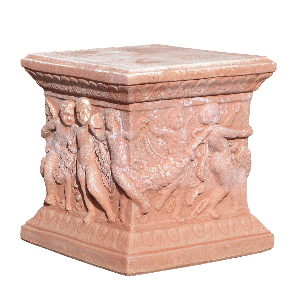Der quadratische Terracotta-Sockel ist ein kunstvoll gestaltetes Kunstwerk, das Eleganz und Anmut ausstrahlt. Er besteht aus hochwertiger Impruneta Terrakotta, einem natürlichen und langlebigen Tonmaterial, das für seine vielseitige Verwendbarkeit geschätzt wird. Der Sockel hat eine gleichmäßige, glatte Oberfläche und eine perfekte quadratische Form. Er ist stabil und solide, was ihm eine robuste Präsenz verleiht. Auf jeder Seite des Sockels sind tanzende Putten in feinen Reliefen kunstvoll dargestellt. Die Putten, kleine geflügelte Engel oder Kinderfiguren, sind in verschiedenen tänzerischen Posen dargestellt. Ihre Bewegungen sind grazile und anmutig, was dem Sockel eine lebhafte und fröhliche Atmosphäre verleiht. Die Details in den Gesichtern, Flügeln und Gewändern der Putten sind präzise ausgearbeitet und zeugen von einer meisterhaften Handwerkskunst.Insgesamt ist dieser quadratische Terracotta-Sockel mit den tanzenden Putten eine meisterhafte Darstellung von handwerklichem Können und künstlerischer Kreativität. Es ist nicht nur ein funktionales Element, sondern auch ein beeindruckendes Kunstwerk, das Bewunderung und Staunen hervorruft.