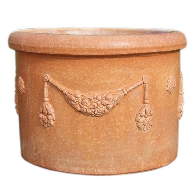 Der Impruneta Terracotta Topf in zylindrischer Form präsentiert sich als kunstvoll gestaltetes Gefäß. Seine zylindrische Struktur aus hochwertiger Terrakotta ist mit einer kunstvollen Ranke verziert, die sich um den Umfang des Topfes schlängelt. Diese Rankenverzierung verleiht dem Topf eine natürliche und ästhetische Note. Am oberen Rand des zylindrischen Topfes befindet sich eine elegante Abschlussborde. Diese Borde dient nicht nur als dekoratives Element, sondern verleiht dem Topf auch eine gewisse Raffinesse und eine zusätzliche Schicht an stilvoller Ausführung. Die Impruneta Terracotta, bekannt für ihre Widerstandsfähigkeit und Frostbeständigkeit bis -30°C, betont nicht nur die natürliche Schönheit des Topfes, sondern gewährleistet auch seine Langlebigkeit und Widerstandsfähigkeit gegen extremere Wetterbedingungen. Dieser Impruneta Terracotta Topf in zylindrischer Form mit Rankenverzierung und Abschlussborde am oberen Rand ist nicht nur ein funktionaler Behälter für Pflanzen, sondern auch ein ästhetisches Dekorationselement für Innen- und Außenbereiche. Seine zeitlose Schönheit und Robustheit machen ihn zu einer herausragenden Wahl für die Gartengestaltung und die Verschönerung von Räumen.