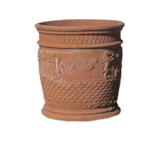 Der Impruneta Terracotta Cylinder ist eine beeindruckende und kunstvoll gestaltete Vase, die die traditionelle Handwerkskunst der Terracotta aus der italienischen Stadt Impruneta verkörpert. Die zylindrische Form verleiht ihr eine elegante Präsenz und bietet gleichzeitig ausreichend Platz für die kunstvollen Verzierungen. Entlang der äußeren Oberfläche des Zylinders sind tanzende Löwen in meisterhafter Weise dargestellt. Jeder Löwe ist lebendig und kraftvoll geformt, mit majestätischen Gesichtszügen und einer anmutigen Haltung, die ihre Stärke und Eleganz unterstreicht. Ihre Körper sind geschmeidig geformt und scheinen in einem lebhaften Tanz zu sein, was dem Zylinder eine dynamische und lebhafte Atmosphäre verleiht.