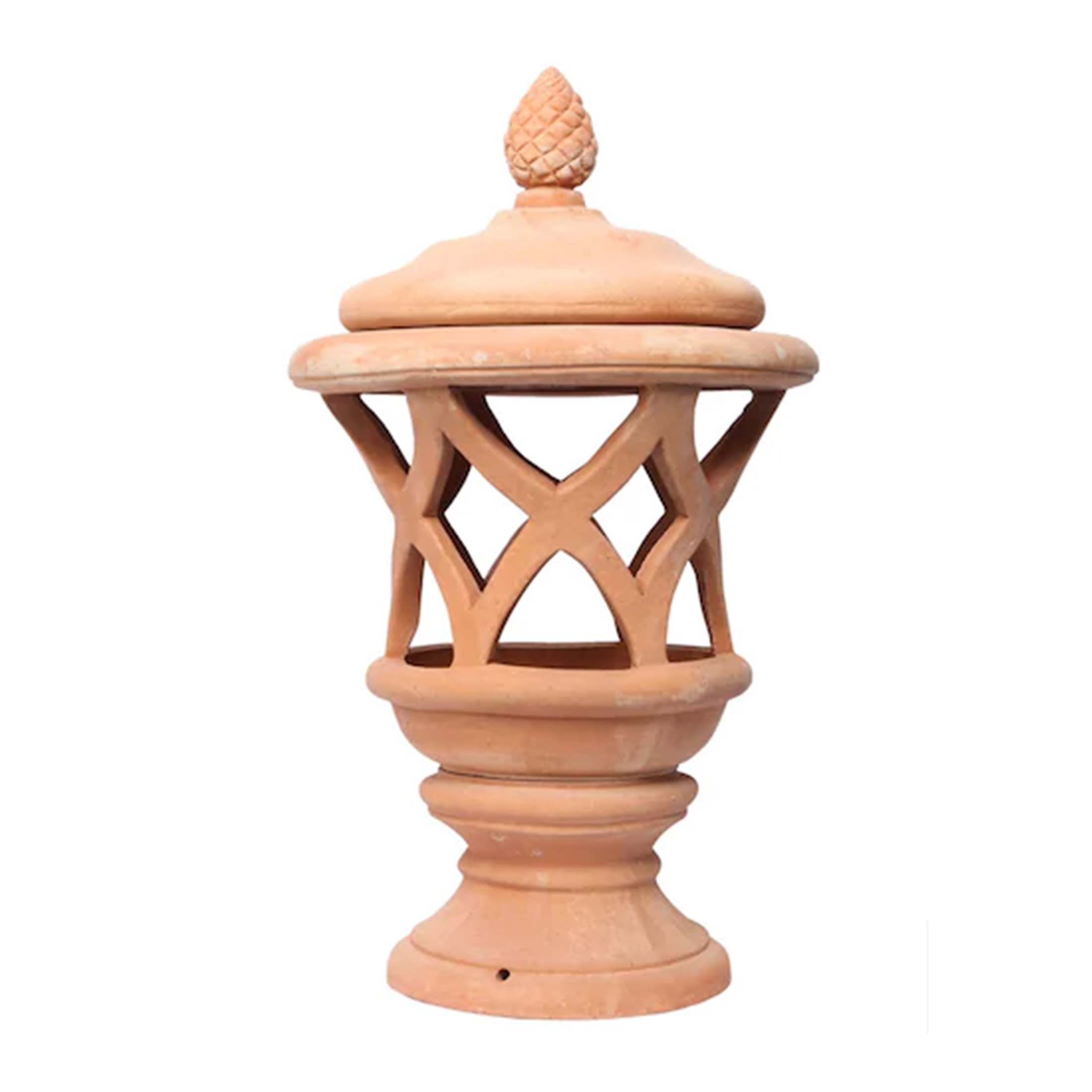 Der Deckel der Laterne ist das Highlight des Designs und zeugt von höchster Handwerkskunst. Er ist mit einem dekorativen Pinienzapfen verziert, der nicht nur als Schmuckstück dient, sondern auch eine praktische Funktion erfüllt. Der Pinienzapfen dient als Griff, um den Deckel anzuheben und das Innere der Laterne zugänglich zu machen. Diese feine Verzierung verleiht der Laterne eine natürliche Note und erinnert an die Schönheit der Natur.