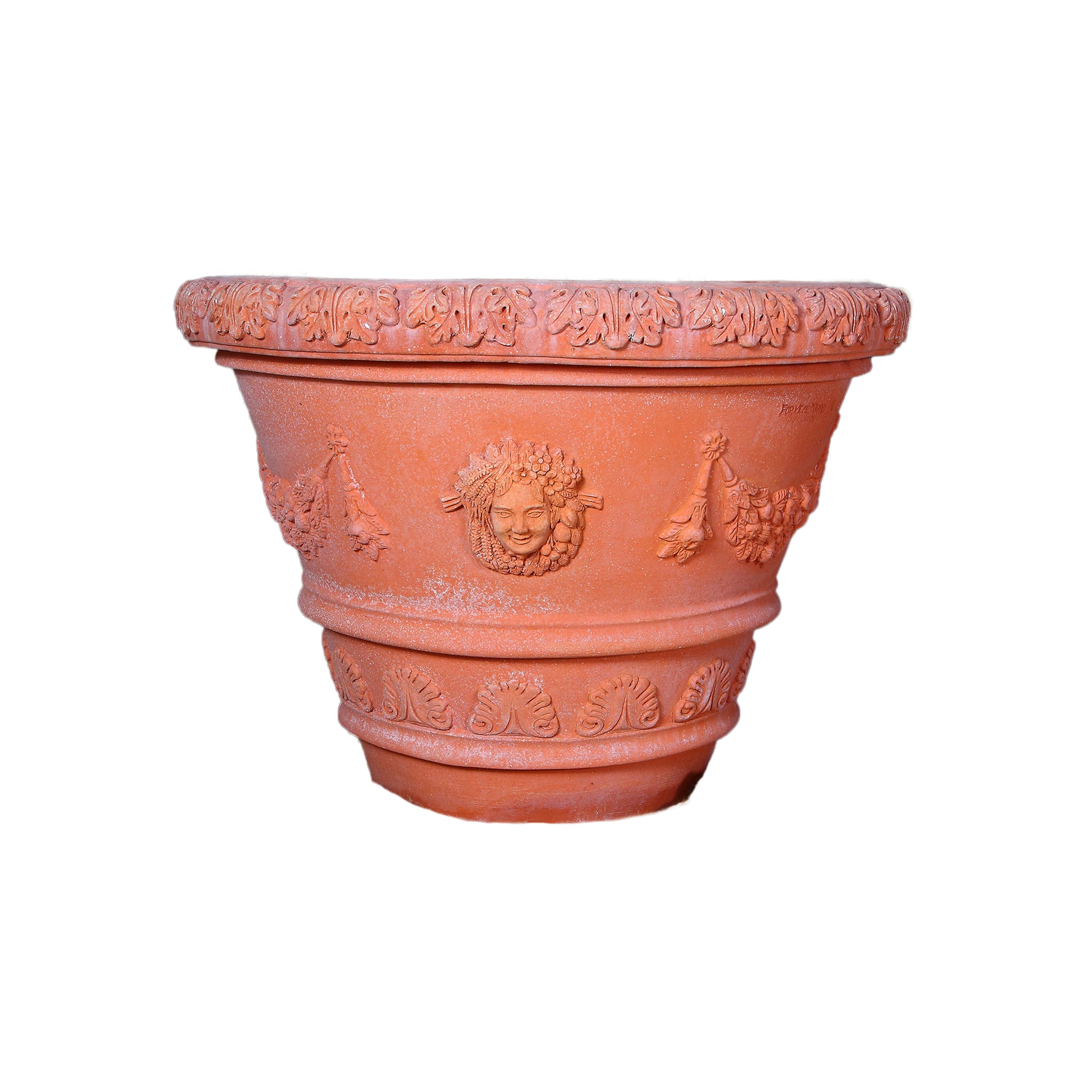 Diese Terrakotta-Vase ist mit Girlanden und Masken als Symbol des Sommers "Estate" verziert. Alle Dekorationen drehen sich um die Sommerzeit: von den Blättern am Rand, über die Masken bis hin zu den Verzierungen am unteren Teil.