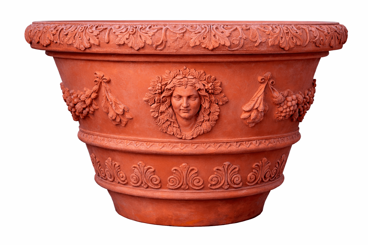 Diese kunstvoll gestaltete Terrakotta-Vase „Estate“ steht ganz im Zeichen des Sommers und bringt mediterranes Flair in Garten, Terrasse oder Eingangsbereich. Die aufwendig gearbeiteten Girlanden und Masken symbolisieren die warme Jahreszeit und werden durch feine Blattmotive am oberen Rand ergänzt. Auch die dekorativen Elemente im unteren Bereich greifen das sommerliche Thema harmonisch auf und verleihen dem Pflanzgefäß eine zeitlose Eleganz.