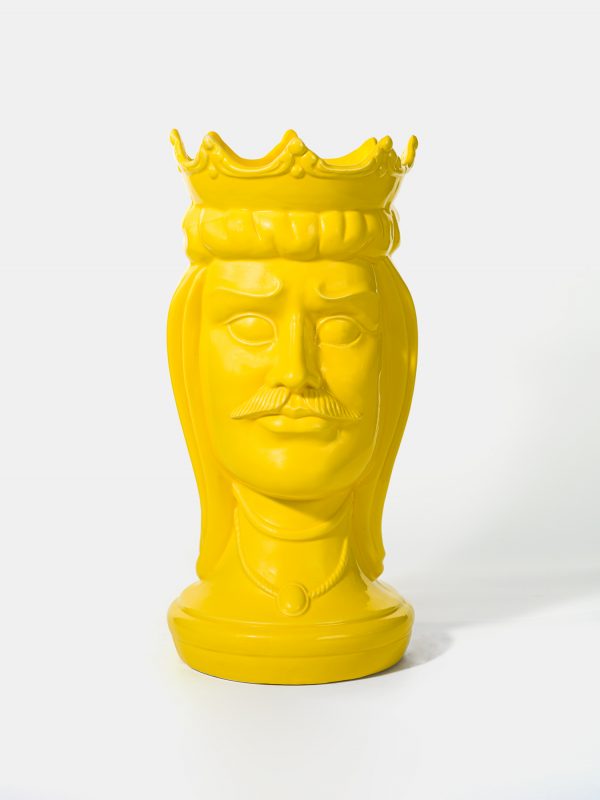 Die gelbe Farbe ist lebhaft und strahlend, füllt den gesamten Kopf und betont dabei die charakteristischen Gesichtszüge. Die Oberfläche ist glatt und gut geformt, um die klaren Konturen des Kopfes hervorzuheben. Die hohen Wangenknochen, die markante Stirn und die präzise gearbeiteten Gesichtszüge sind in diesem lebendigen Gelb tonangebend und erzeugen ein Gefühl von Kraft und Ausdrucksstärke.