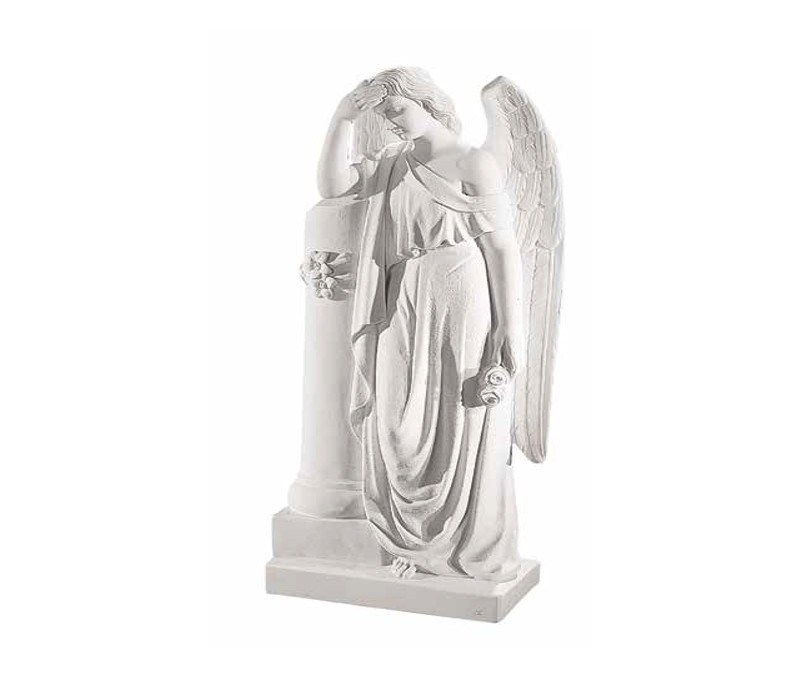 Der trauernde Engel aus Carrara Marmor Gemisch ist eine eindrucksvolle Skulptur, die eine junge Frau in Engelsform darstellt. Die Figur steht mit geschlossenen Augen und einem traurigen Gesichtsausdruck da, was ihre tiefe Trauer und emotionale Betroffenheit vermittelt. Ihre Flügel sind ausgebreitet und verleihen der Szene eine gewisse Erhabenheit. Der Engel lehnt sich an eine Säule, umgeben von einer Atmosphäre der Stille und Kontemplation. Mit ihrem rechten Arm stützt sie sich auf der Säule ab, während sie ihren Kopf mit nachdenklichem Blick darauf ruhen lässt. In ihrer linken Hand hält sie Blumen, vielleicht als Symbol für Vergänglichkeit und Schönheit. Das Gewand des Engels erinnert an antike Statuen, mit fließenden Linien und klassischen Formen, die eine zeitlose Ästhetik vermitteln. Die Skulptur strahlt eine ruhige Würde aus und zieht den Betrachter in ihren Bann, während sie die tiefen menschlichen Emotionen des Verlustes und der Trauer verkörpert. Zur Wahl stehen Carrara Marmor, Marmor aus Apulien oder eine Marmor Mischung. Wir unterbreiten Ihnen gerne ein unverbindliches Angebot.