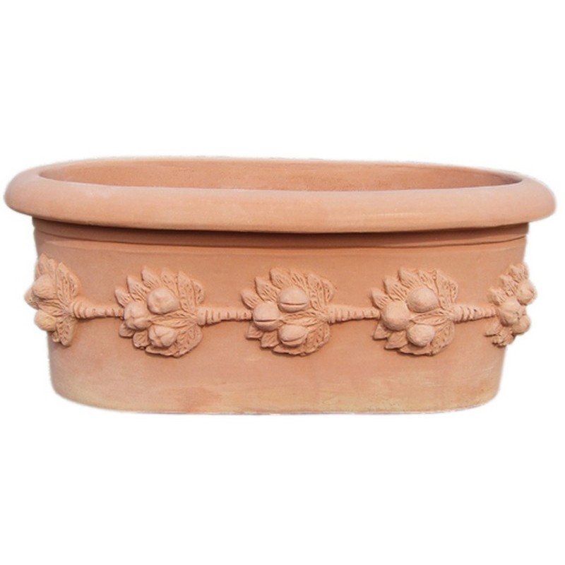 Ein ovaler Terracotta-Pflanztopf aus Impruneta, handgearbeitet in der Toskana und verziert mit einer charmanten Ranken aus Obst, ist ein exquisites Gartenaccessoire, das traditionelle Handwerkskunst mit rustikalem Charme verbindet. Dieser großzügige Pflanztopf hat eine ovale Form, die ihm eine elegante Präsenz verleiht. Die Oberfläche des Terracotta-Topfes ist glatt und zeigt die charakteristische natürliche Textur und die warmen, erdigen Farbtöne von Impruneta-Terracotta. Die sorgfältige Handarbeit ist spürbar, und die Qualität des Materials unterstreicht die Liebe zum Detail, die in die Herstellung eingeflossen ist. Was diesen Pflanztopf besonders reizvoll macht, ist die kunstvoll gearbeitete Ranke aus Obst, die den oberen Rand des Topfes umgibt. Diese Ranken sind mit Obst wie Äpfeln, Trauben oder anderen Früchten verziert und verleihen dem Topf einen charmanten und ländlichen Charakter. Die feinen Details der Ranken verleihen dem Pflanztopf eine lebendige Ausstrahlung und lassen ihn wie ein Kunstwerk wirken.