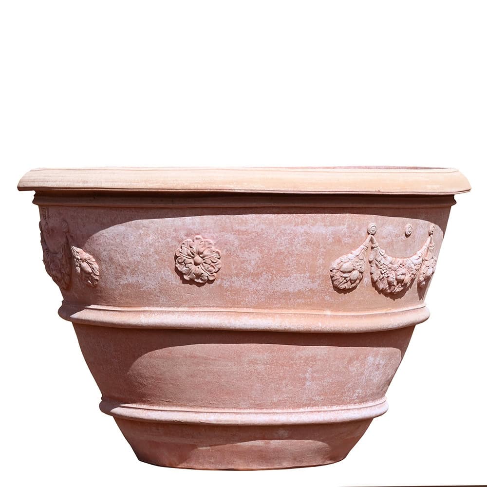 Der Topf beeindruckt durch seine klassische Verzierung: umlaufende Rankenmotive kombiniert mit einer stilvollen Rosette im Medici-Stil. Dieses elegante Dekor erinnert an die Renaissance und findet sich auch in den weltberühmten Boboli-Gärten in Florenz, wo ähnliche Gefäße prachtvolle Alleen und Orangerien schmücken.
