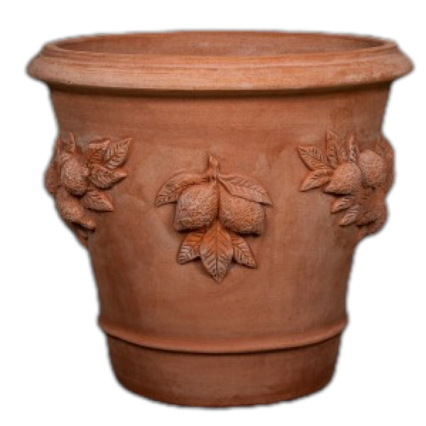 Massiver, edler, runder Terracottatopf aus Impruneta. Blumentopf mit Zitronen Handgemachter Terracottatopf aus original Impruneta Erde. Pflanztopf mit Innenmaßen. Frostsicher bis -30°C Der Blumenkübel ist in zwei Größen erhätlich