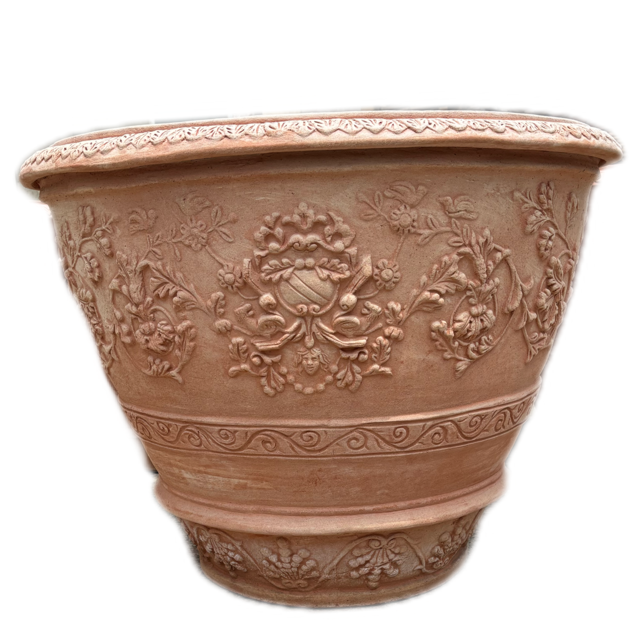 Sein Design vereint klassische Ästhetik mit Zurückhaltung: Zarte florale Ornamente, fein modellierte Cherubim und ein stilisiertes Wappen zieren die Oberfläche. Trotz der reichen Dekoration wirkt der Topf niemals überladen – die kunstvolle Gestaltung bleibt dezent und ausgewogen, wodurch er sich harmonisch in verschiedene Garten- und Terrassenstile einfügt. Ein edles Stück toskanischer Handwerkskunst, das sowohl Pflanzen als auch Auge erfreut.
