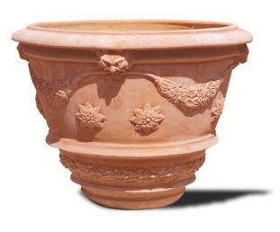 Reich verzierter, runder Terracottatopf aus Impruneta. Die edlen Verzierungen mit floralen Elementen und Sartyrköpfen