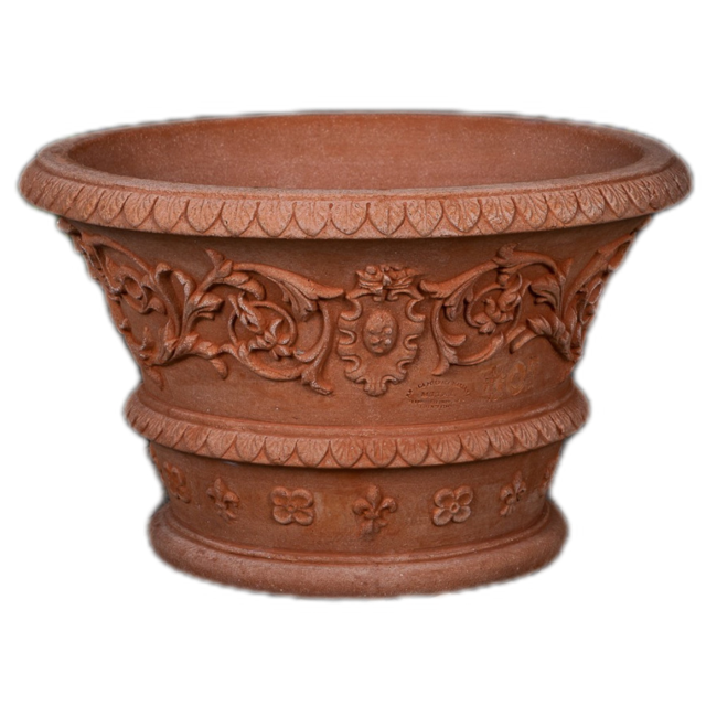 Unser flacher, reich verzierter Blumentopf aus Impruneta Terrakotta ist ein wahres Meisterwerk der Handwerkskunst, das mit seiner opulenten Gestaltung alle Blicke auf sich zieht. Dieser Blumentopf ist ein beeindruckendes Beispiel für die Schönheit und Vielseitigkeit von Terrakotta. Die Oberfläche des Blumentopfs ist mit einer Fülle von floralen Elementen geschmückt, die in kunstvollen Mustern angeordnet sind. Zarte Blütenranken winden sich um den Rand des Topfes, während elegante Rosetten und florentinische Lilien das Zentrum der Verzierungen bilden. Diese florale Symphonie verleiht dem Topf eine romantische und zeitlose Ästhetik, die an die Pracht vergangener Epochen erinnert. Besonders auffällig sind die stilisierten Faunköpfe, die als markante Akzente an den Seiten des Blumentopfs angebracht sind. Diese mythologischen Figuren, halb Mensch und halb Tier, fügen dem Design eine faszinierende Tiefe und Dimension hinzu und verleihen dem Blumentopf einen Hauch von Mystik und Eleganz.