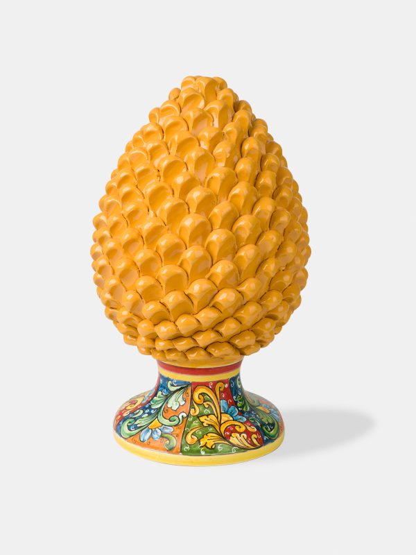 Der verzierte gelbe Pinienzapfen ist ein handgefertigtes Kunstwerk aus Sizilien, das traditionelle Handwerkskunst mit lebhaften Farben und symbolischer Bedeutung verbindet. Der Pinienzapfen, der auf einem verzierten Fuß thront, ist leuchtend gelb und mit filigranen Blumendekorationen in den Farben Grün, Rot und Blau geschmückt. Diese dekorativen Details verleihen ihm einen lebendigen und farbenfrohen Charakter, der die sizilianische Handwerkskunst widerspiegelt.