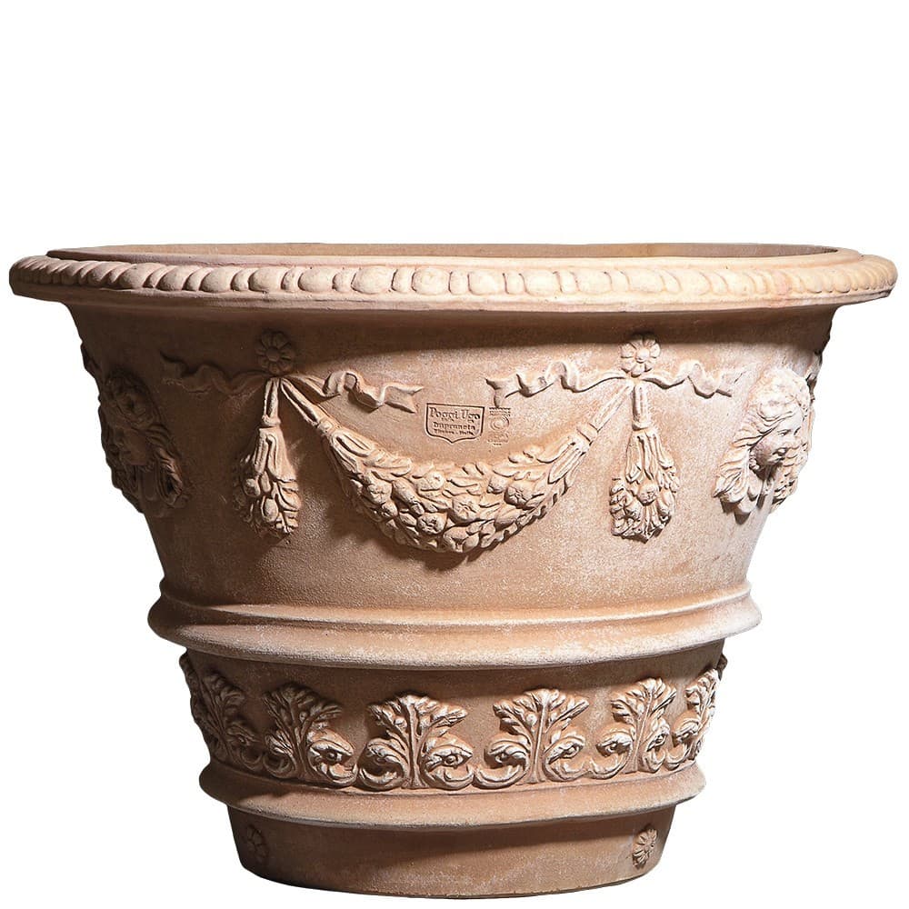 Dieser große, reich verzierte Pflanzkübel aus original Impruneta-Terracotta ist ein echtes Meisterwerk traditioneller toskanischer Handwerkskunst. Hergestellt aus dem charakteristisch warm-rötlichen Ton der Region, besticht er durch seine detailreiche Verzierung: kunstvoll gearbeitete Ranken, elegante Bänder und stilisierte Akanthusblätter schmücken seine Oberfläche und verleihen ihm ein klassisch-mediterranes Flair.