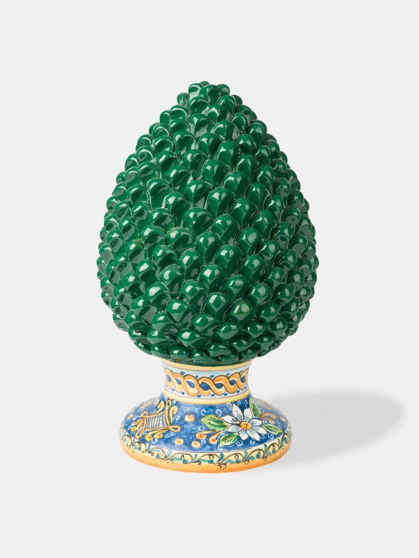 Der grüne Pinienzapfen aus Keramik ist ein handgefertigtes Meisterwerk sizilianischer Handwerkskunst. Der Fuß des Pinienzapfens ist kunstvoll verziert mit einem filigranen Blumendekor auf einem tiefblauen Hintergrund, was dem Objekt eine ansprechende und elegante Note verleiht. Der Pinienzapfen selbst, als Symbol der Lebenskraft, Unsterblichkeit und Fruchtbarkeit, ist tief in verschiedenen Zivilisationen verwurzelt. In der sizilianischen Tradition wird er als Glücksbringer betrachtet und soll, wenn er im Haus ausgestellt wird, der dort lebenden Familie Gesundheit und Wohlstand schenken.