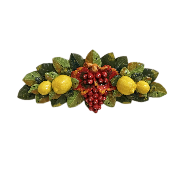 Diese Wanddekoration genannt Soprafinestre (über den Fenstern), gefertigt in der Toskana aus handbemalter Keramik, zeigt einen bunte Dekoration aus Zitronen, Trauben und Blättern, die über einem Fenster oder einer Tür montiert ist. Die Keramik selbst ist kunstvoll gestaltet, um das typische toskanische Motiv von Zitronen, Trauben und Blättern darzustellen. Die lebendigen Farben der Zitronen, das satte Violett der Trauben und das frische Grün der Blätter werden präzise und detailreich auf die Keramik gemalt. Jedes Element wird mit einer Klarheit und Genauigkeit dargestellt, die die Schönheit der Natur in der Toskana widerspiegelt. Die Handbemalung verleiht dem Soprafinestre eine einzigartige Persönlichkeit und einen handgefertigten Charakter, der die traditionelle Handwerkskunst dieser Region unterstreicht.