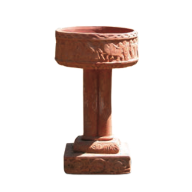 Das Wasserbecken, das aus Impruneta Terracotta gefertigt ist, ist ein beeindruckendes Kunstwerk, das sowohl Eleganz als auch Raffinesse ausstrahlt. Die Basis des Beckens besteht aus einer Zwillingssäule, die auf einem quadratischen Sockel ruht. Diese Säulen verleihen dem Becken Stabilität und eine majestätische Präsenz. Auf diesen Säulen thront ein rundes, flaches Wasserbecken, das durch seine schlichte Formgebung besticht. Die äußere Oberfläche des Beckens ist mit einem faszinierenden byzantinischen Relief verziert, das dem gesamten Stück eine künstlerische und historische Dimension verleiht. Die kunstvollen Details des Reliefs zeigen eine reiche Symbolik und erwecken das Becken zum Leben. Dieses Wasserbecken aus Impruneta Terracotta strahlt eine zeitlose Schönheit aus und wird sicherlich zum Mittelpunkt jedes Gartens oder Innenhofs. Mit seiner harmonischen Kombination aus traditioneller Handwerkskunst und künstlerischem Design bietet es nicht nur eine funktionale Wasserquelle, sondern auch eine ästhetische Bereicherung für jeden Raum.